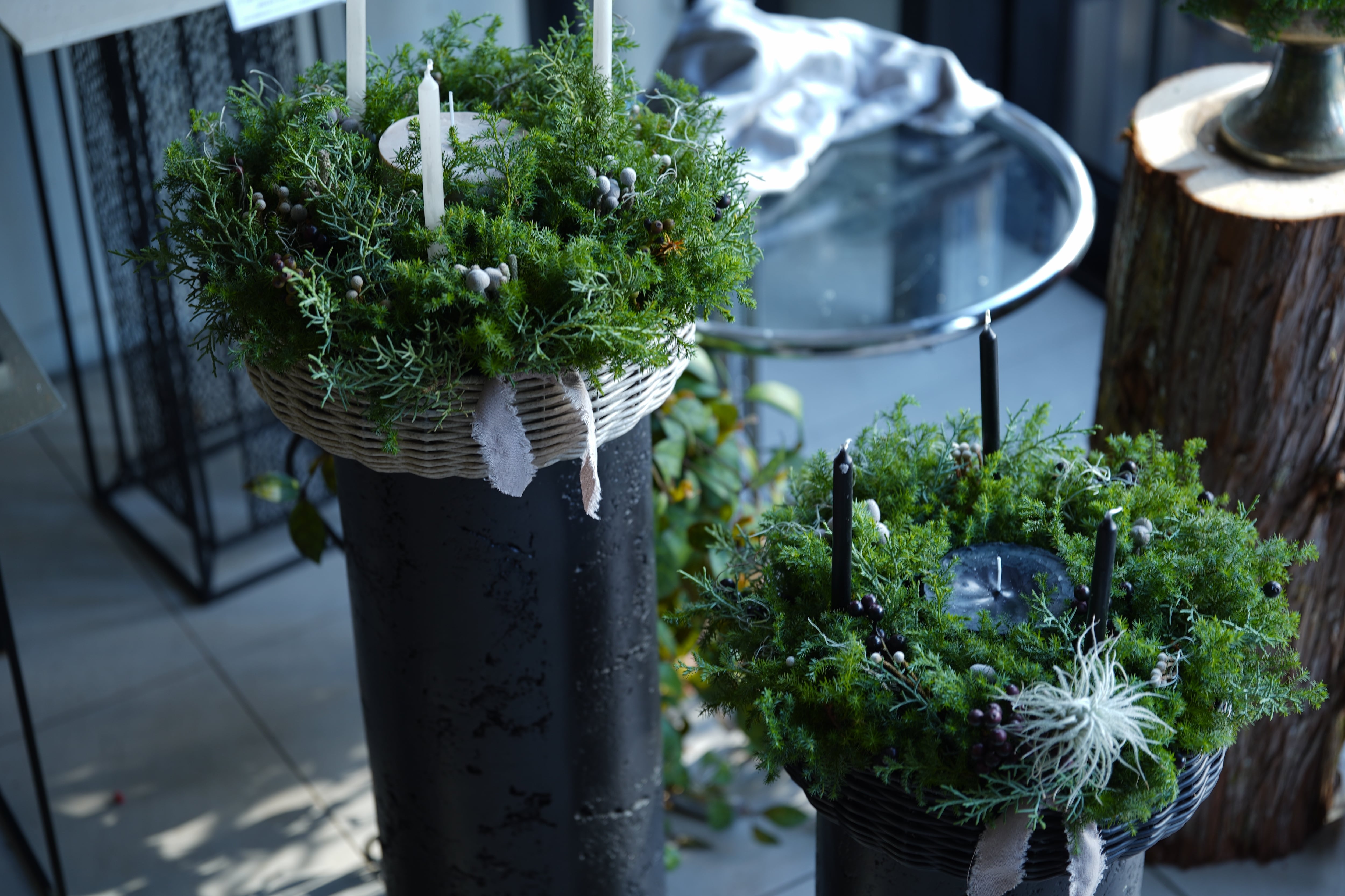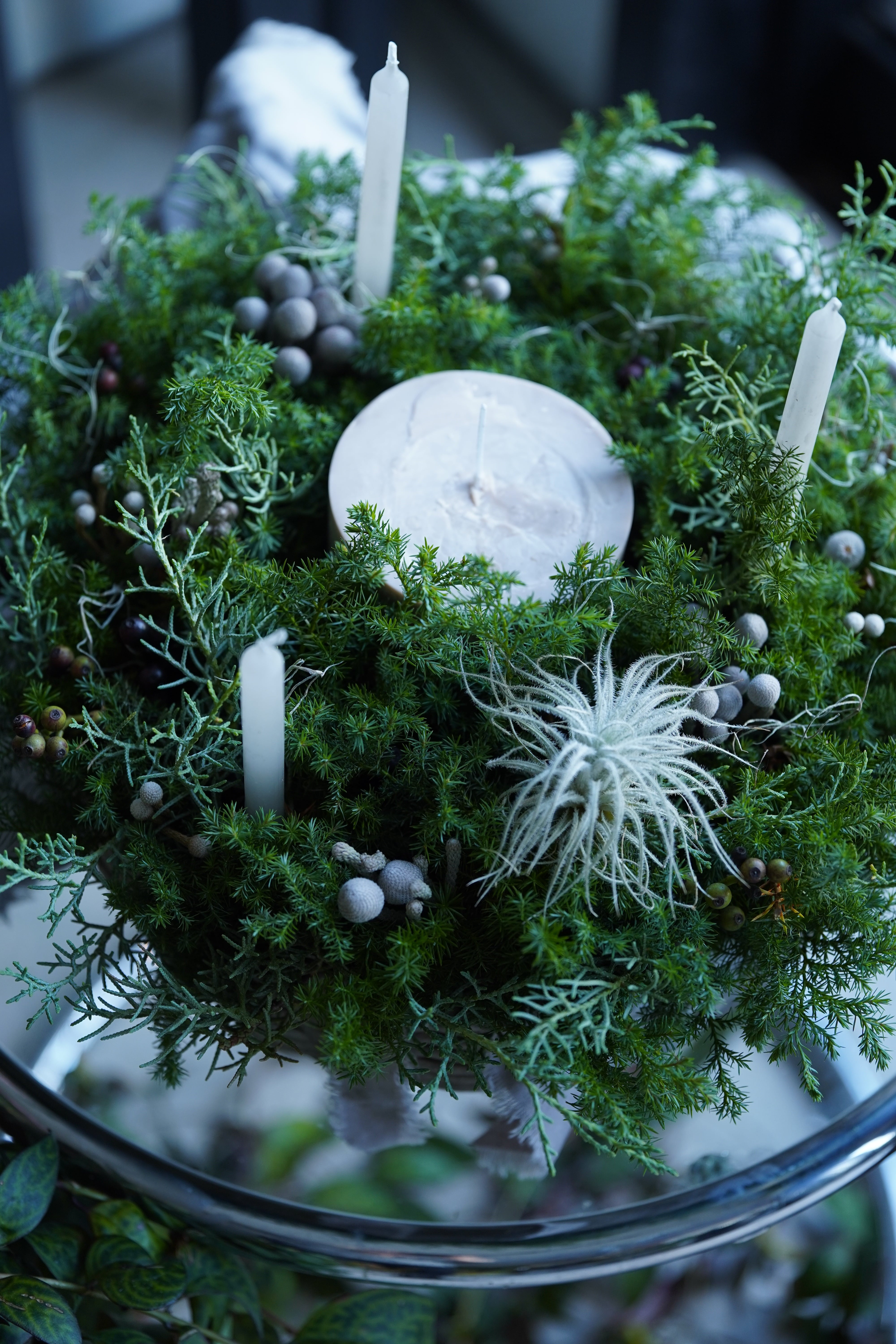 針葉樹やモノトーンな実物を使ったリース型キャンドルアレンジメント。